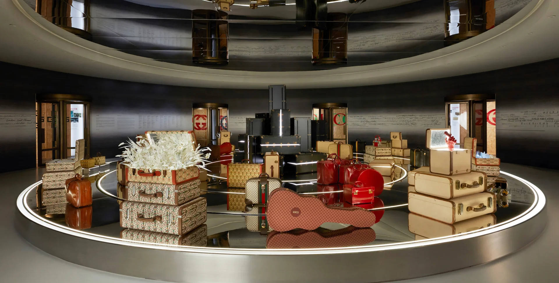 About - Gucci's Cosmos exhibition is an immersive exploration of the brand's decades of creativity. The exhibition traces one of many possible constellations connecting the ideas and inventions of creative directors over the past 102 years.